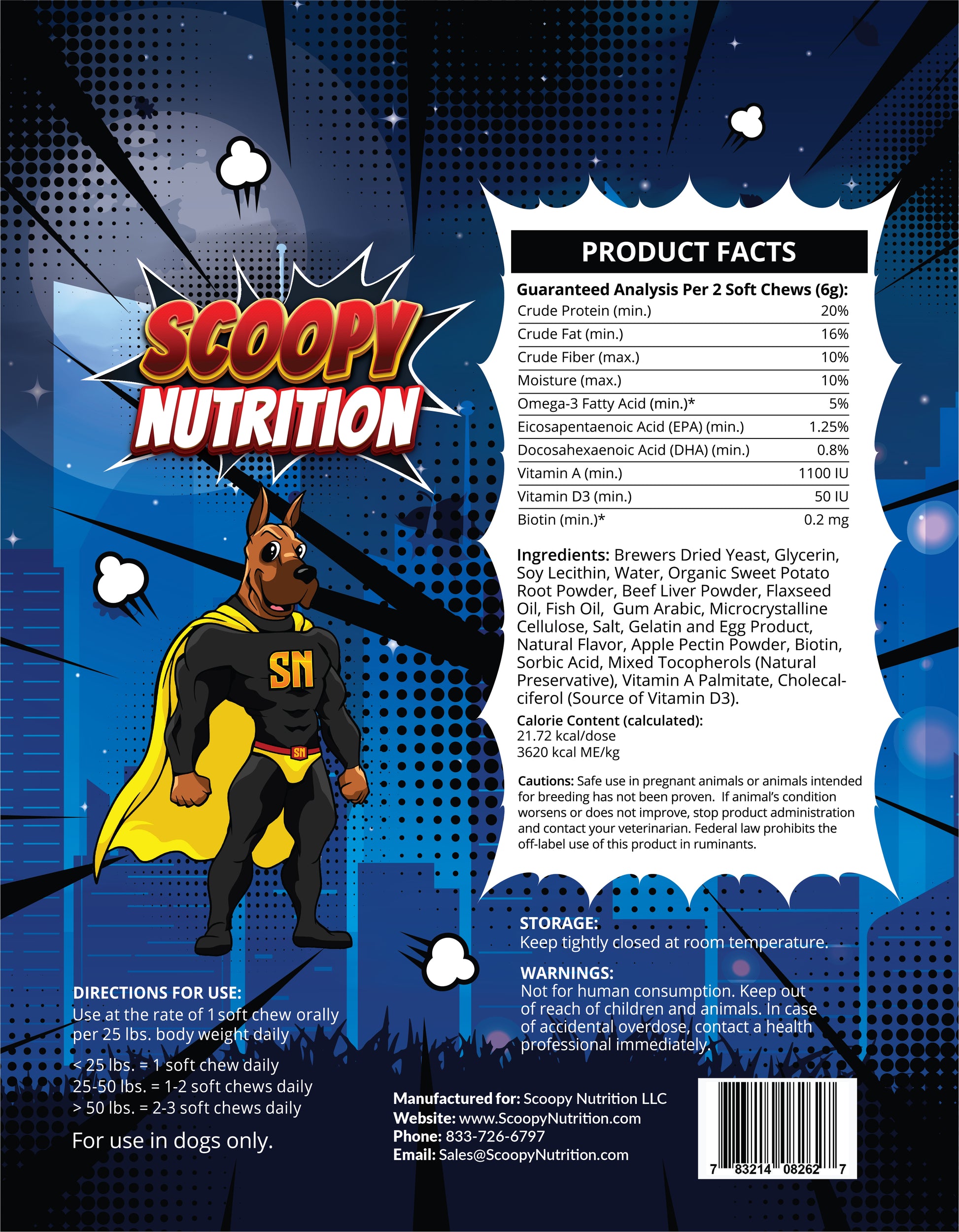 A dull, dry, or itchy coat is often a sign that your Hero is missing vital fatty acids. Scoopy Nutrition Skin & Coat is an elite-level formula designed to fuel a resilient skin shield and a high-definition coat from the core. We don't just add a splash of oil; we provide a concentrated blend of Omega-3s, Biotin, and Vitamins to stop the itch and start the shine.